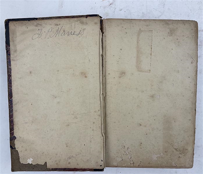 Fair to good. The spine is detached but text block remains complete and stable. Pages clean with moderate age toning and foxing typical of the period. Marbled boards present with edge wear. Ownership name (“J.P. Maness”) on front endpaper.