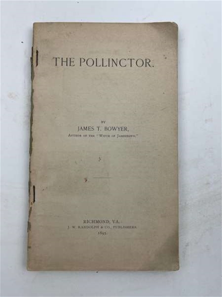Octavo, stitched pamphlet, 22 pp. A scarce Southern literary work by James T. Bowyer, author of The Witch of Jamestown. The title—Pollinctor, meaning “embalmer” in Latin—suggests the story’s morbid and allegorical tone, typical of the late 19th-century Southern Gothic style. Published by J.W. Randolph & English, one of Richmond’s most historically significant firms known for postbellum Southern literature and Confederate memorial publications.