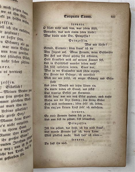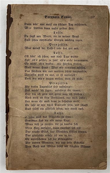 This partial volume preserves the closing sections of Goethe’s celebrated verse drama Torquato Tasso, first published in 1790 and widely reprinted throughout the 19th century. The pages are printed in traditional blackletter (Fraktur) on wove paper and show the beautiful typography and mellow toning characteristic of mid-century German editions. The running head “Torquato Tasso” and the concluding Epilog confirm this as part of a collected works set, bound continuously with other Goethe plays such as Egmont and Iphigenie auf Tauris.