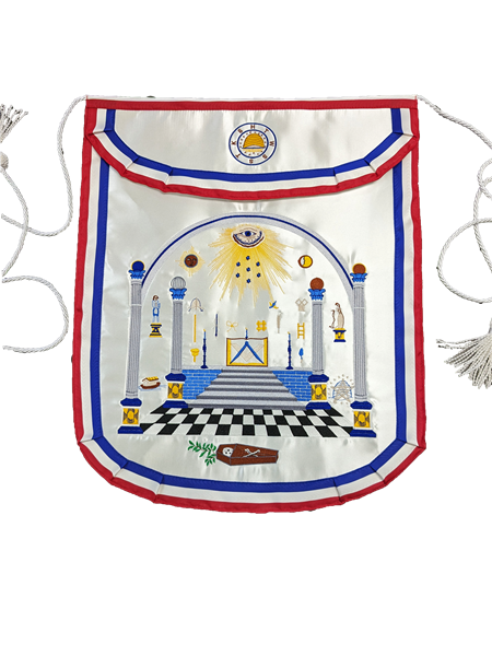 The Lafayette Apron of white satin and embroidered by Madame Lafayette, was presented to Bro.Washington by Bro. Lafayette in August of 1784. The apron was presented to the Grand Lodge of Pennsylvania by the Washington Benevolent Society on July 3, 1829, and is now on display in the Grand Lodge Museum at the Masonic Temple in Philadelphia. The body and flap are rounded, and has vibrant colors in the Symbols and border. Everything on this apron is Symbolic. Bro. Frank W. Bobb, Grand Lodge Librarian and curator, has used the meanings most widely accepted by Masonic Scholars in interpreting all of the symbolism depicted on the George Washington Apron. For example, the border colors on the apron of Red, White, and Blue, are the National colors of the United States and France. This helps to represent the friendship between Washington and Layfayette.