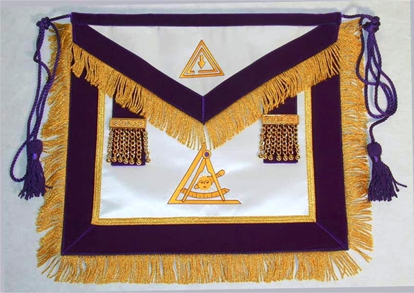 Past Thrice Illustrious Master Apron with Fringe. Many in Freemasonry describe this P.T.I. M. Apron as stunning. It is 14 x 16 inches made of Satin. The silk embroidery compliments the purple VELVET trim with gold non-tarnish fringe and braid at inner ribbon edge. Imported gold metal-ball fringe on side tabs. Satin lined.