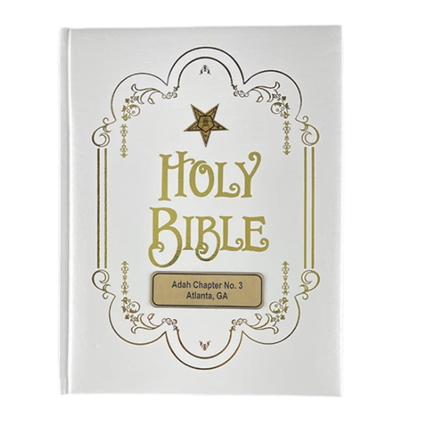 This Eastern Star Family/Wedding Bible is a beautifully detailed edition designed for family use, lodge presentations, or special occasions. It features a presentation page, family record page, full Bible dictionary, colored atlas, and fully illustrated content for enhanced study and enjoyment. The Bible is bound in white leatherette and finished with a Lasertech‑engraved Eastern Star emblem, giving it both an elegant look and meaningful symbolism.