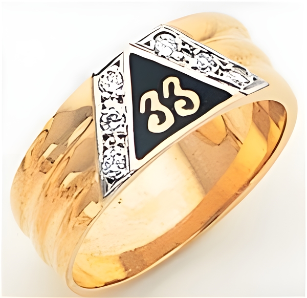 33 Degree Scottish Rite Ring - Your choice of 10K, 14K, White or Yellow gold with 8.5mm Band, Triangle in black enamel with 6 1/5CT. diamonds included. This ring is a special order and takes 4 to 6 weeks for delivery. Be certain of your size due to a $25 return fee. *