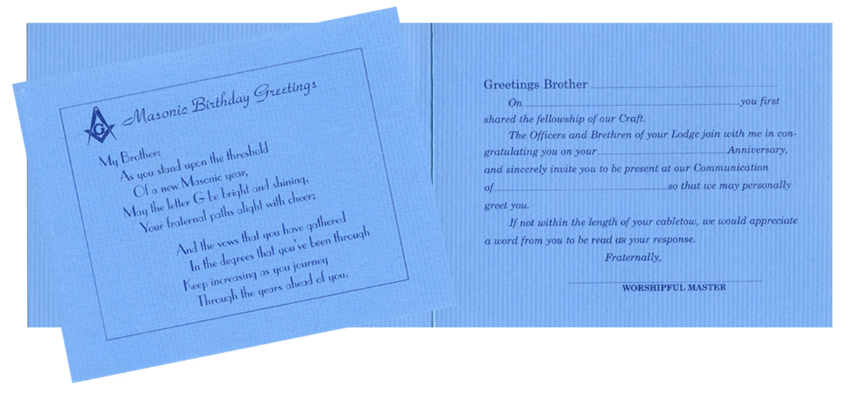 Join our email list and get great deals and save money.Click Here to Join. Cards w/ envelopes Purchase at least 100 and save $0.05 each Macoy Greeting Cards Purchase at least 100 and save $0.15 each Blue Masonic Birthday Card with White Envelop Price: $2.50 SKU2095_ENV - + Add To Cart Add to wishlist Email a friend Tweet