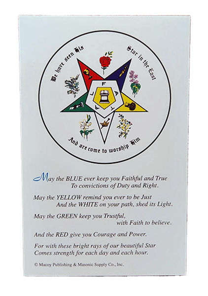 The Eastern Star Motto in full color with appropriate verse describing the five colors of the O.E.S on a beautiful postcard Verse states: "May the Blue ever keep you Faithful and True To convictions of Duty and Right. May the Yellow remind you ever to be Just And the White on your path, shed its Light. May the Green keep you Trustful, with Faith to believe. And the Red give you Courage and Power. For with these bright rays of our beautiful Star comes strength for each day and each hour."