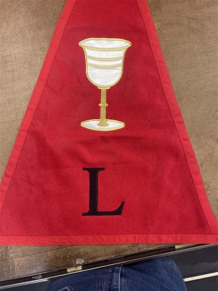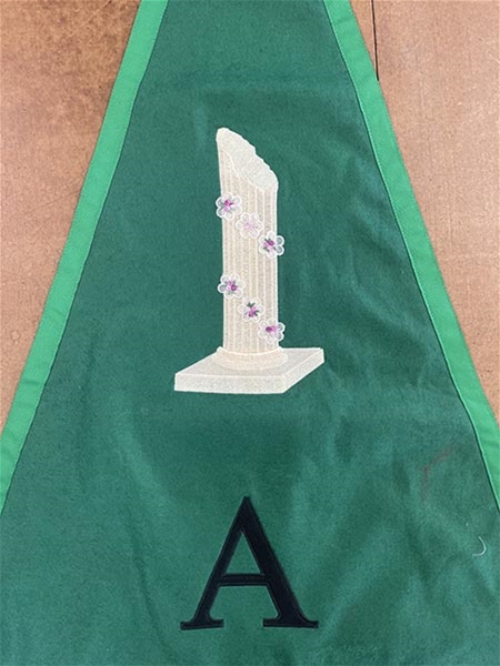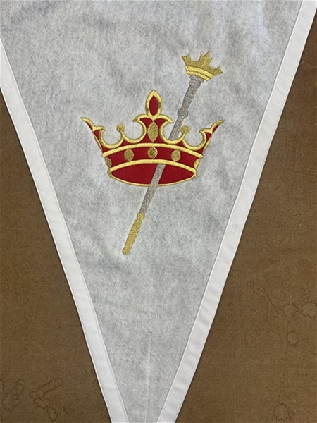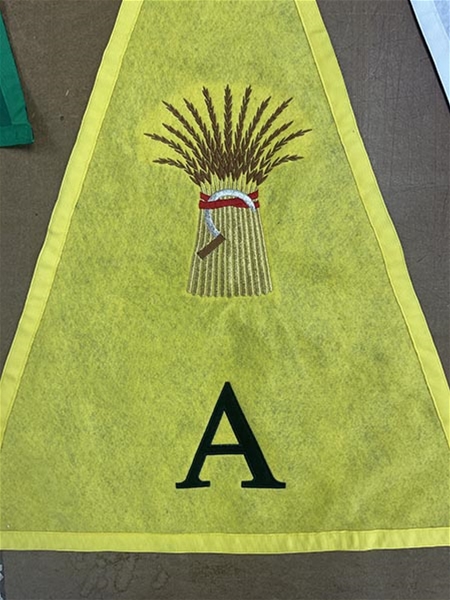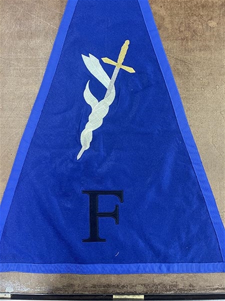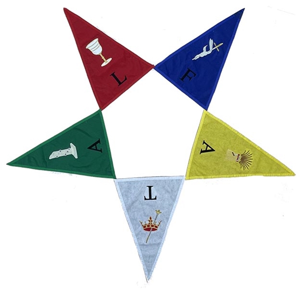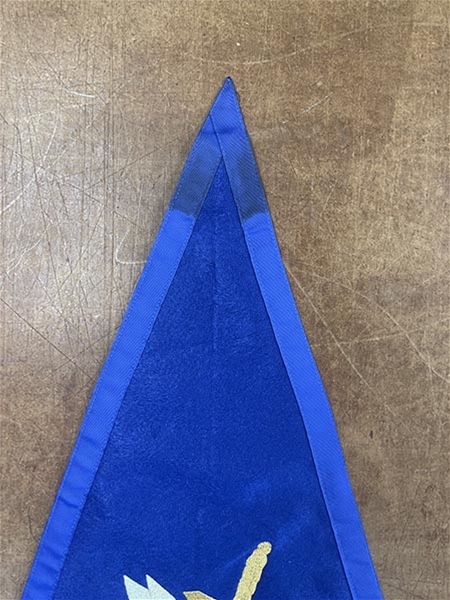 Quality wool felt, each point in appropriate colors with machine embroidered emblems. FATAL appears in black embroidered letters as shown. Self color 1" ribbon binding. Points are joined in the proper order. On the OPEN center carpets, two ends are provided with fasteners so it is easy to take up when not in use and to store flat. Throw with converging closed center may also be folded with one flap on top of the other for storing. Blue Tip discolored.