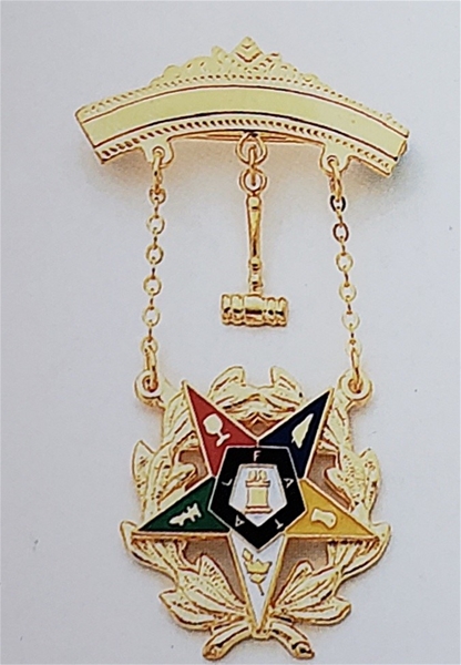 Pretty Past Matron/Patron jewel with large wreath and enameled star. Attaches with pin. Gold vermeil (.925 sterling silver with gold overlay). The jewel for the ladies comes with a gavel hanging from the top curved bar. If the jewel is for the Patron, it will come with a square and compass drop. Macoy swinger jewels are made with painstaking care by skillful craftsmen. The design and workmanship give the wearer a pride of ownership.